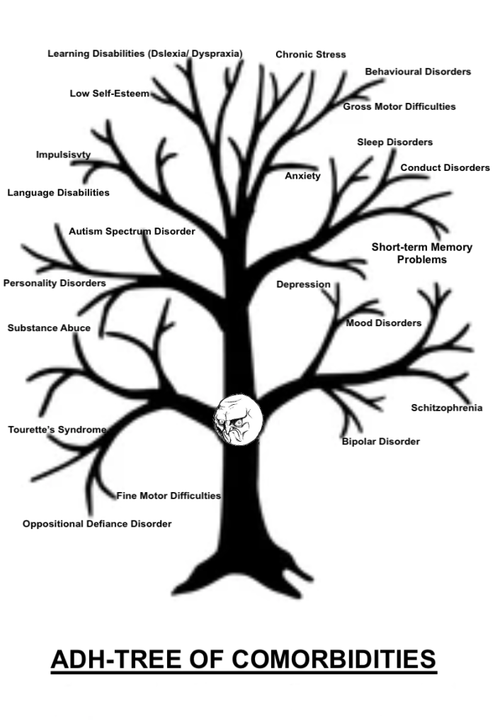 ADHD has very high comorbidity levels. This means that if you have ADHD, it’s likely you simultaneously have one or more disorders, conditions, or disabilities. The image above depicts some examples that have links to, or are comorbid with ADHD…